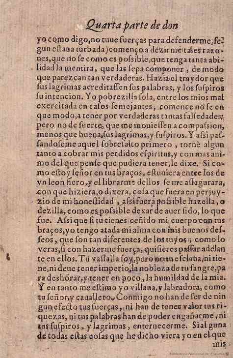 »Y así, pasándoseme aquel sobresalto primero, torné algún tanto a cobrar mis perdidos espíritus, y con más ánimo del que pensé que pudiera tener, le dije: ''Si como estoy, señor, en tus brazos, estuviera entre los de un león fiero y el librarme dellos se me asegurara con que hiciera, o dijera, cosa que fuera en perjuicio de mi honestidad, así fuera posible hacella o decilla como es posible dejar de haber sido lo que fue. Así que, si tú tienes ceñido mi cuerpo con tus brazos, yo tengo atada mi alma con mis buenos deseos, que son tan diferentes de los tuyos como lo verás si con hacerme fuerza quisieres pasar adelante en ellos. Tu vasalla soy, pero no tu esclava; ni tiene ni debe tener imperio la nobleza de tu sangre para deshonrar y tener en poco la humildad de la mía; y en tanto me estimo yo, villana y labradora, como tú, señor y caballero. Conmigo no han de ser de ningún efecto tus fuerzas, ni han de tener valor tus riquezas, ni tus palabras han de poder engañarme, ni tus suspiros y lágrimas enternecerme. Si alguna de todas estas cosas que he dicho viera yo en el que