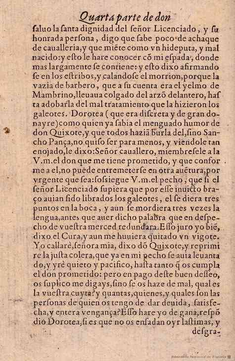 Dorotea, que era discreta y de gran donaire, como quien ya sabía el menguado humor de don Quijote y que todos hacían burla dél, sino Sancho Panza, no quiso ser para menos, y, viéndole tan enojado, le dijo: -Señor caballero, miémbresele4 a la vuestra merced el don que me tiene prometido, y que, conforme a él, no puede entremeterse en otra aventura, por urgente que sea; sosiegue vuestra merced el pecho, que si el señor licenciado supiera que por ese invicto brazo habían sido librados los galeotes, él se diera5 tres puntos en la boca, y aun se mordiera6 tres veces la lengua, antes que haber dicho palabra que en despecho de vuestra merced redundara.