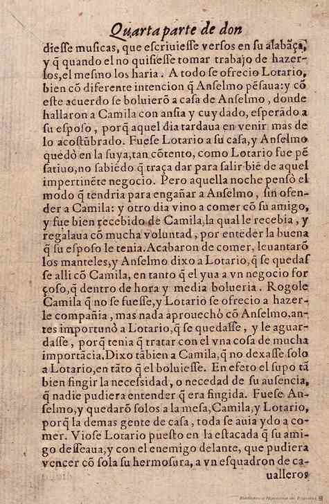 »Fuese Lotario a su casa, y Anselmo quedó en la suya, tan contento como Lotario fue pensativo, no sabiendo qué traza dar para salir bien de aquel impertinente negocio1. Pero aquella noche pensó el modo que tendría para engañar a Anselmo, sin ofender a Camila; y otro día vino a comer con su amigo, y fue bien recebido de Camila, la cual le recebía y regalaba con mucha voluntad, por entender la buena que su esposo le tenía. »Acabaron de comer, levantaron2 los manteles y Anselmo dijo a Lotario que se quedase allí con Camila, en tanto que él iba a un negocio forzoso, que dentro de hora y media volvería. Rogóle Camila que no se fuese y Lotario se ofreció a hacerle compañía, más nada aprovechó con Anselmo; antes, importunó a Lotario que se quedase y le aguardase, porque tenía que tratar con él una cosa de mucha importancia. Dijo también a Camila que no dejase solo a Lotario en tanto que él volviese. En efeto, él supo tan bien fingir la necesidad, o necedad, de su ausencia, que nadie pudiera entender que era fingida. Fuese Anselmo, y quedaron solos a la mesa Camila y Lotario, porque la demás gente de casa toda se había ido a comer. Viose Lotario puesto en la estacada que su amigo deseaba y con el enemigo delante, que pudiera vencer con sola su hermosura a un escuadrón de ca