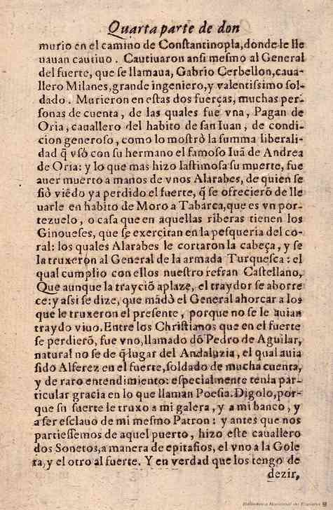 »Entre los cristianos que en el fuerte se perdieron, fue uno llamado don Pedro de Aguilar, natural no sé de qué lugar del Andalucía, el cual había sido alférez en el fuerte, soldado de mucha cuenta8 y de raro entendimiento: especialmente tenía particular gracia en lo que llaman poesía. Dígolo porque su suerte le trujo a mi galera y a mi banco, y a ser esclavo de mi mesmo patrón; y, antes que nos partiésemos de aquel puerto, hizo este caballero dos sonetos, a manera de epitafios, el uno a la Goleta y el otro al fuerte. Y en verdad que los tengo de9