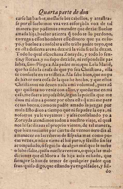 »Mas, como pocas veces, o nunca, viene el bien puro y sencillo, sin ser acompañado o seguido de algún mal que le turbe o sobresalte, quiso nuestra ventura, o quizá las maldiciones que el moro a su hija había echado, que siempre se han de temer de cualquier padre que sean; quiso, digo, que estando ya engolfados y sien
