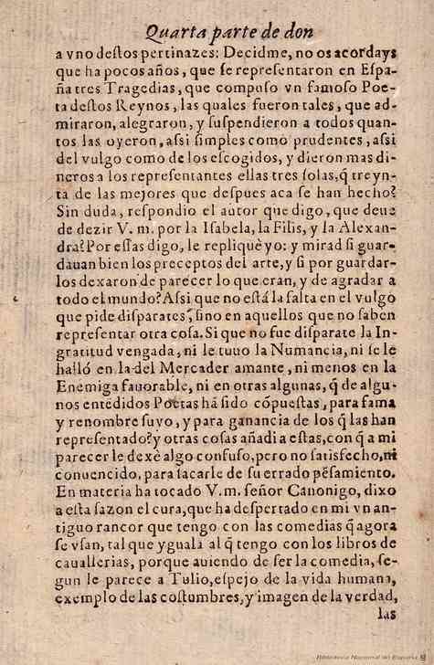 a uno destos pertinaces: ''Decidme, ¿no os acordáis que ha pocos años que se representaron en España tres tragedias que compuso un famoso poeta destos reinos, las cuales fueron tales, que admiraron, alegraron y suspendieron a todos cuantos las oyeron, así simples como prudentes, así del vulgo como de los escogidos, y dieron más dineros1 a los representantes ellas tres solas que treinta de las mejores que después acá se han hecho?'' ''Sin duda -respondió el autor que digo-, que debe de decir vuestra merced por La Isabela, La Filis y La Alejandra''. ''Por ésas digo -le repliqué yo-; y mirad si guardaban bien los preceptos del arte, y si por guardarlos dejaron de parecer lo que eran y de agradar a todo el mundo. Así que no está la falta en el vulgo, que pide disparates, sino en aquellos que no saben representar otra cosa. Sí, que no fue disparate La ingratitud vengada, ni le tuvo La Numancia, ni se le halló en la del Mercader amante, ni menos en La enemiga favorable, ni en otras algunas que de algunos entendidos poetas han sido compuestas, para fama y renombre suyo, y para ganancia de los que las han representado''. Y otras cosas añadí a éstas, con que, a mi parecer, le dejé algo confuso, pero no satisfecho ni convencido para sacarle de su errado pensamiento.